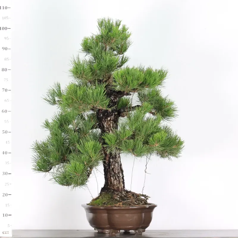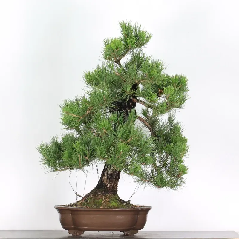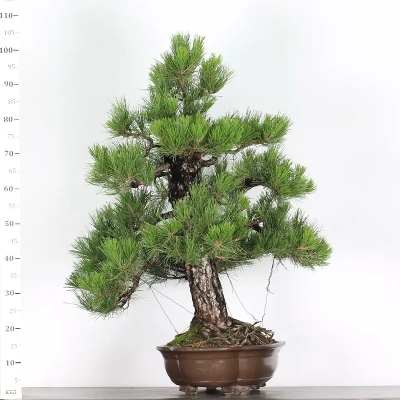 The Thunbergii Pine is a virile species par excellence: a straight, magnificent, powerful tree, firmly seated in its pot, rising toward the sky. The dark trunk, with its cracked bark, offers a striking contrast with the fairly light green needles, full of freshness and health.