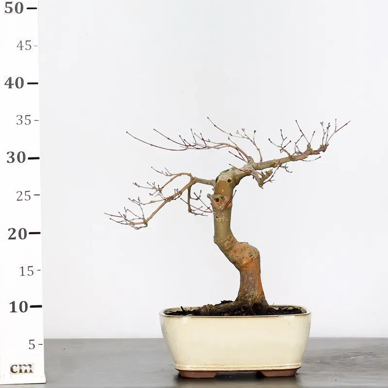 The Japanese red Maple "Deshojo" bonsai captivates with its spectacular evolution throughout the seasons. Its foliage begins a deep red in spring, gradually turning green in summer, and then displays superb shades of orange-red in autumn, offering a magnificent spectacle to behold all year round.