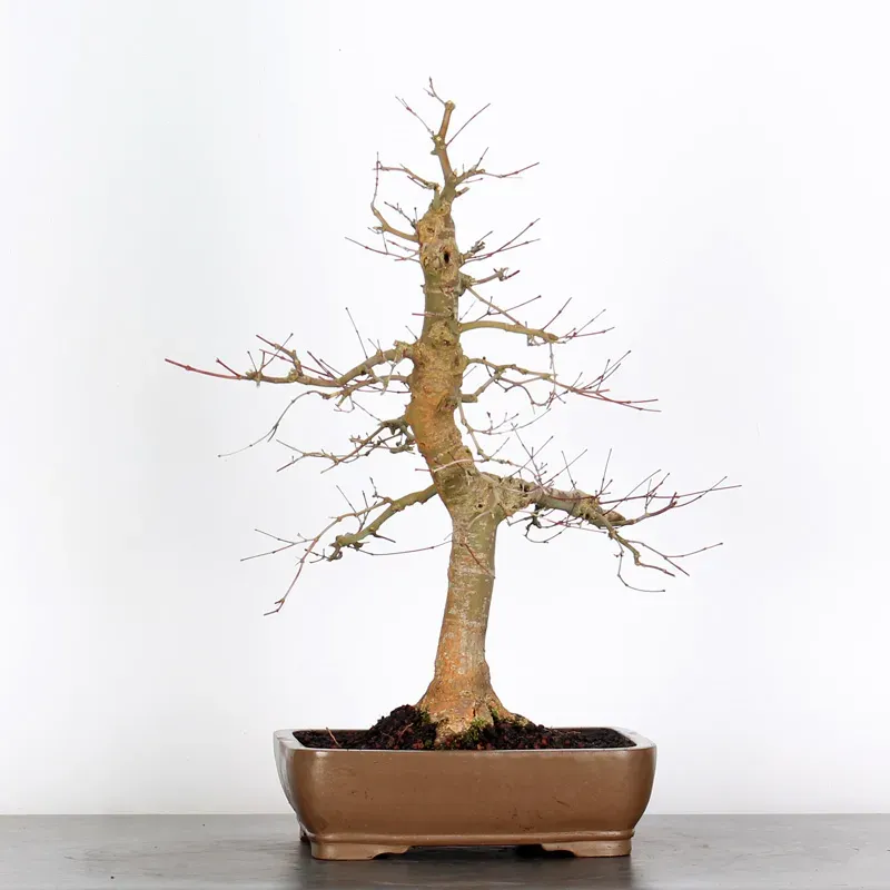 The Japanese red Maple "Deshojo" bonsai captivates with its spectacular evolution throughout the seasons. Its foliage begins a deep red in spring, gradually turning green in summer, and then displays superb shades of orange-red in autumn, offering a magnificent spectacle to behold all year round.