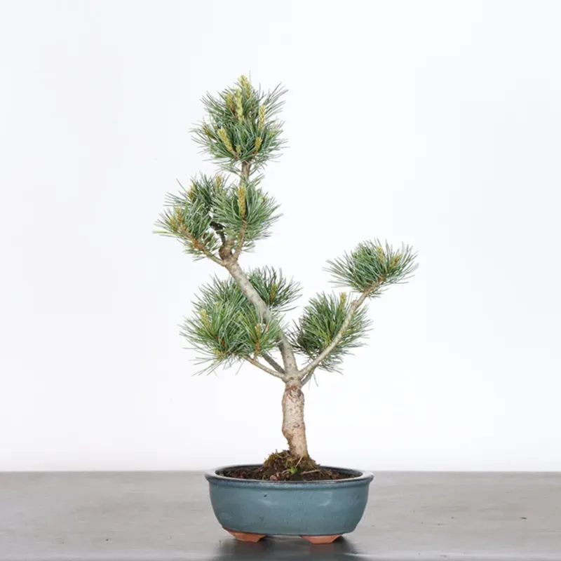 The Japanese white pine has needles sheathed in fives, green/blue colors, it is a high mountain tree and slow growing, it is grafted on black pine.