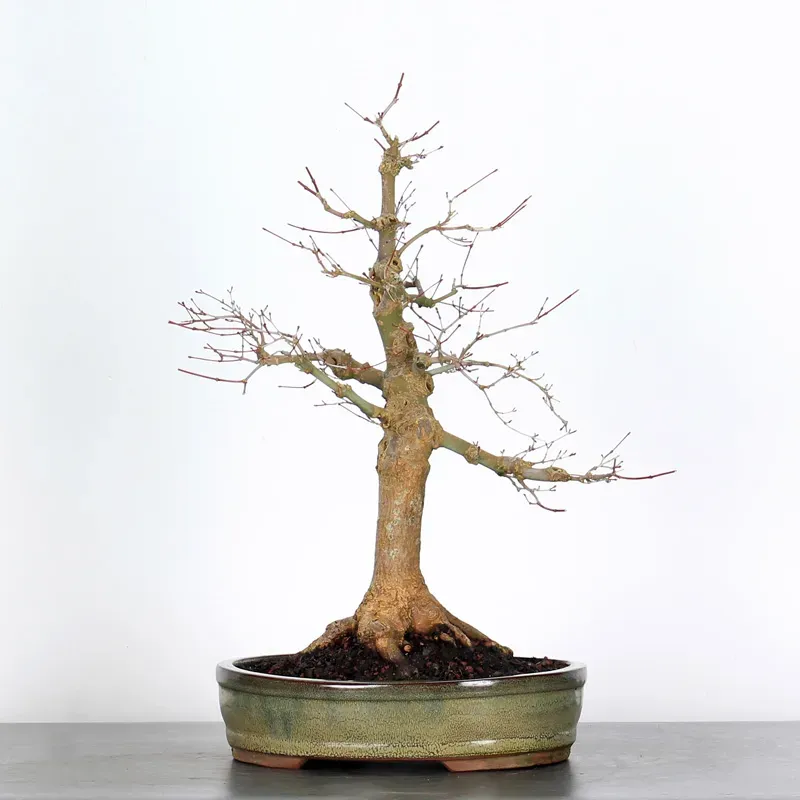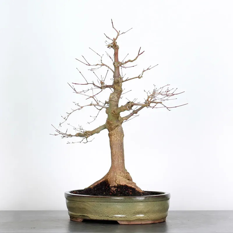 The Japanese red maple "Deshojo" bonsai captivates with its spectacular evolution throughout the seasons. Its foliage begins a deep red in spring, gradually turning green in summer, and then displays superb shades of orange-red in autumn, offering a magnificent spectacle to behold all year round.
