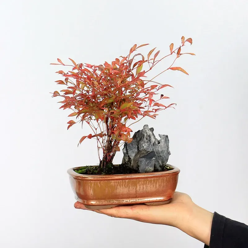 Place it outdoors year-round in a spot with alternating sun and shade, sheltered from cold or drying winds. Sacred bamboo is suitable for all climates thanks to its hardiness. If the climate is too windy or too cold (below -12°C), protect it by wrapping the pot with horticultural fleece or fiberglass to protect its roots from frost.