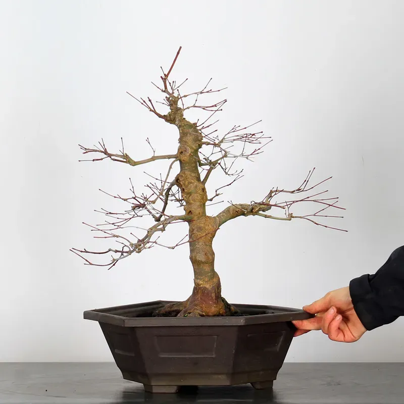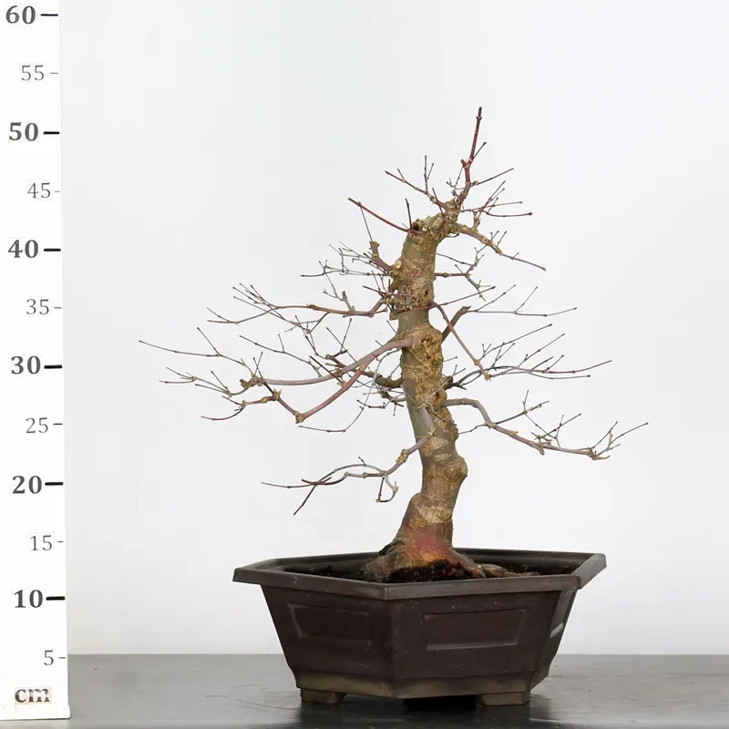 The Japanese red maple "Deshojo" bonsai captivates with its spectacular evolution throughout the seasons. Its foliage begins a deep red in spring, gradually turning green in summer, and then displays superb shades of orange-red in autumn, offering a magnificent spectacle to behold all year round.