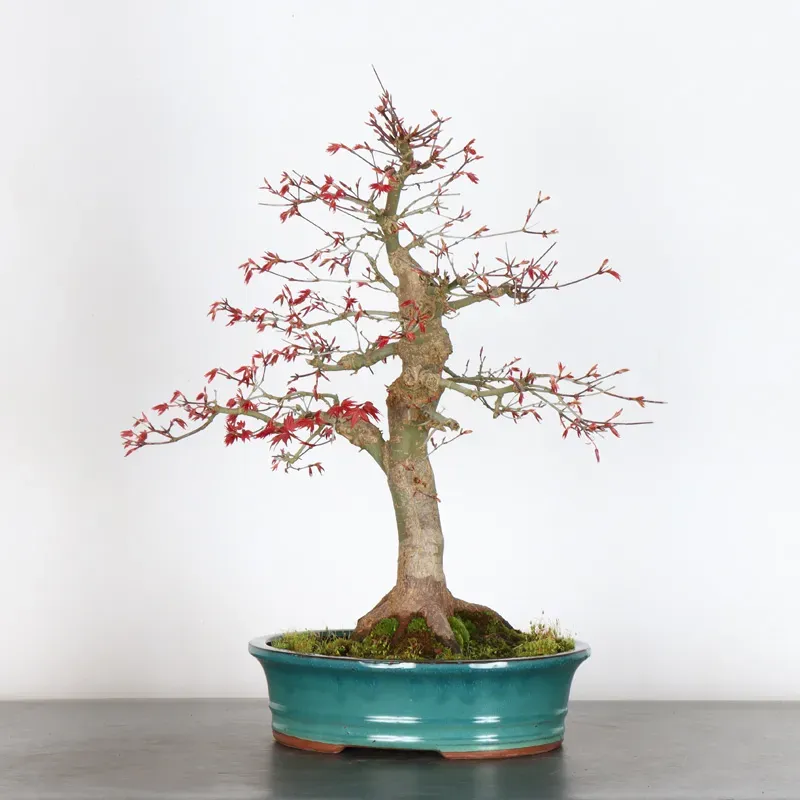 The Japanese red maple "Deshojo" bonsai captivates with its spectacular evolution throughout the seasons. Its foliage begins a deep red in spring, gradually turning green in summer, and then displays superb shades of orange-red in autumn, offering a magnificent spectacle to behold all year round.
