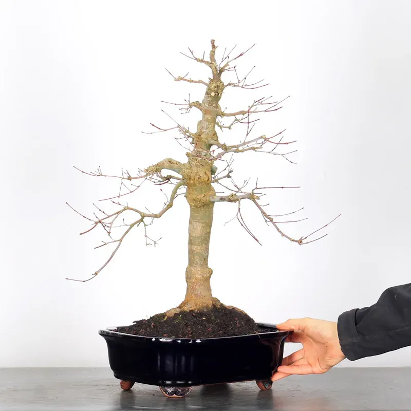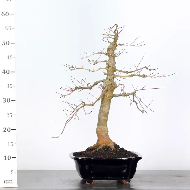 The Japanese red Maple "Deshojo" bonsai captivates with its spectacular evolution throughout the seasons. Its foliage begins a deep red in spring, gradually turning green in summer, and then displays superb shades of orange-red in autumn, offering a magnificent spectacle to behold all year round.