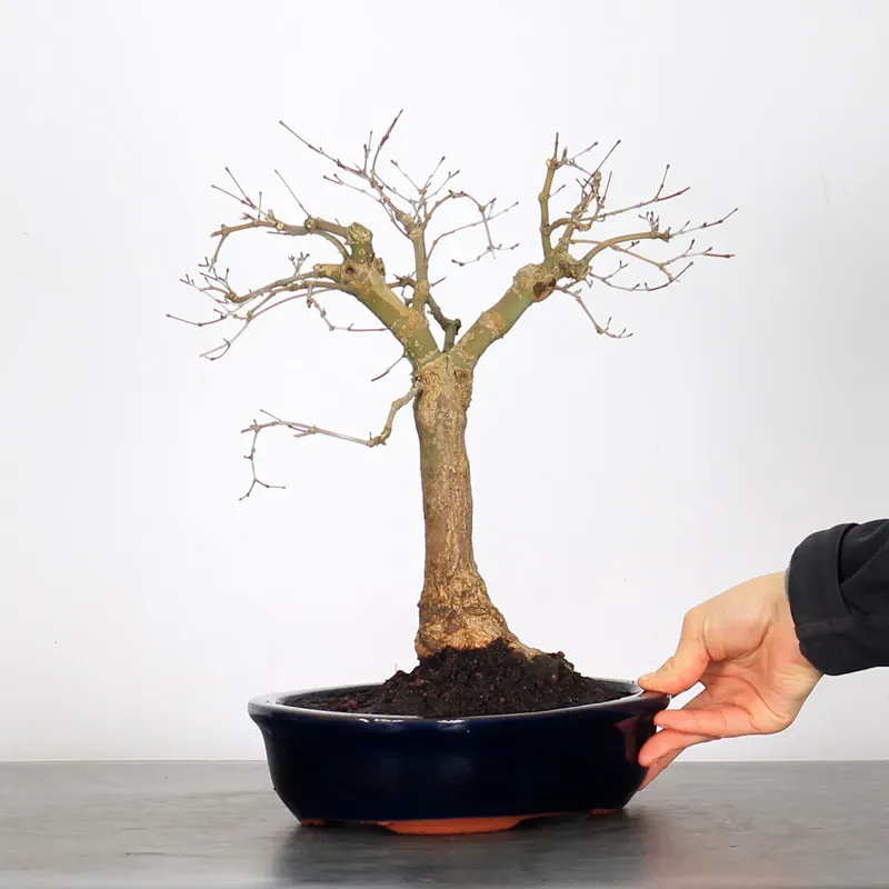 The Japanese red Maple "Deshojo" bonsai captivates with its spectacular evolution throughout the seasons. Its foliage begins a deep red in spring, gradually turning green in summer, and then displays superb shades of orange-red in autumn, offering a magnificent spectacle to behold all year round.