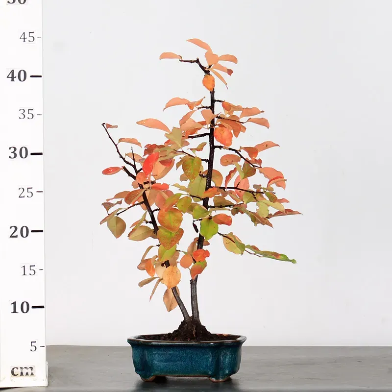 The quince tree "Cydonia oblonga" is a small fruit tree ideal for bonsai. It is easy to train and wire, making it perfect for beginners. Its foliage turns beautiful red and orange hues in the fall, and with good care, it can flower and produce beautiful, fragrant fruit after a few years.
