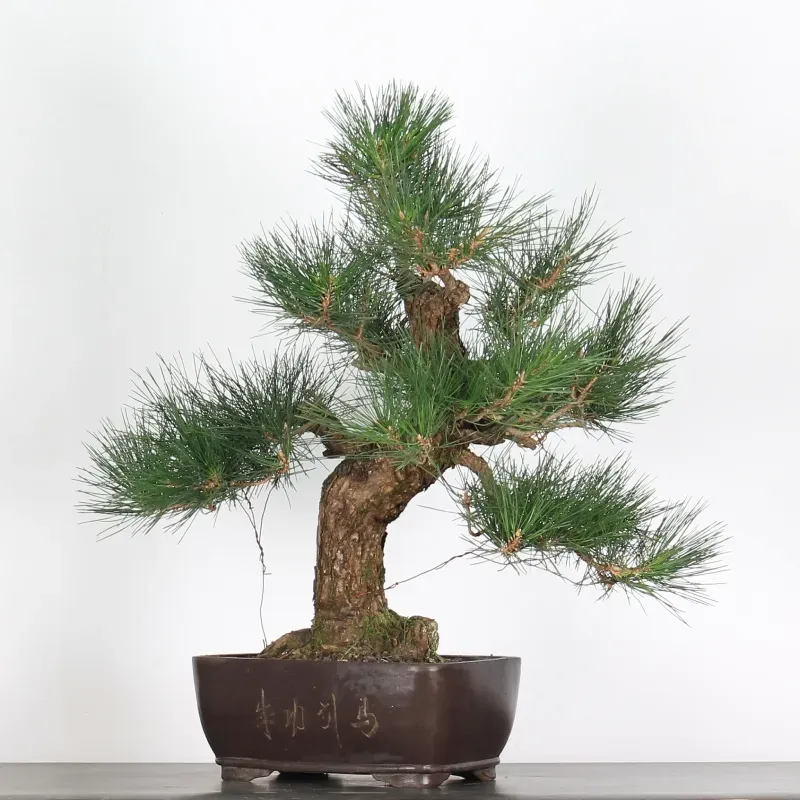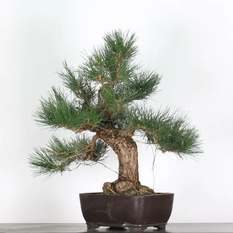 The Thunbergii Pine is a virile species par excellence: a straight, magnificent, powerful tree, firmly seated in its pot, rising toward the sky. The dark trunk, with its cracked bark, offers a striking contrast with the fairly light green needles, full of freshness and health.