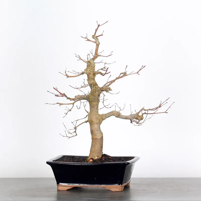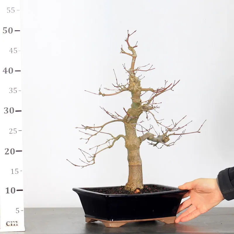 The Japanese red Maple "Deshojo" bonsai captivates with its spectacular evolution throughout the seasons. Its foliage begins a deep red in spring, gradually turning green in summer, and then displays superb shades of orange-red in autumn, offering a magnificent spectacle to behold all year round.
