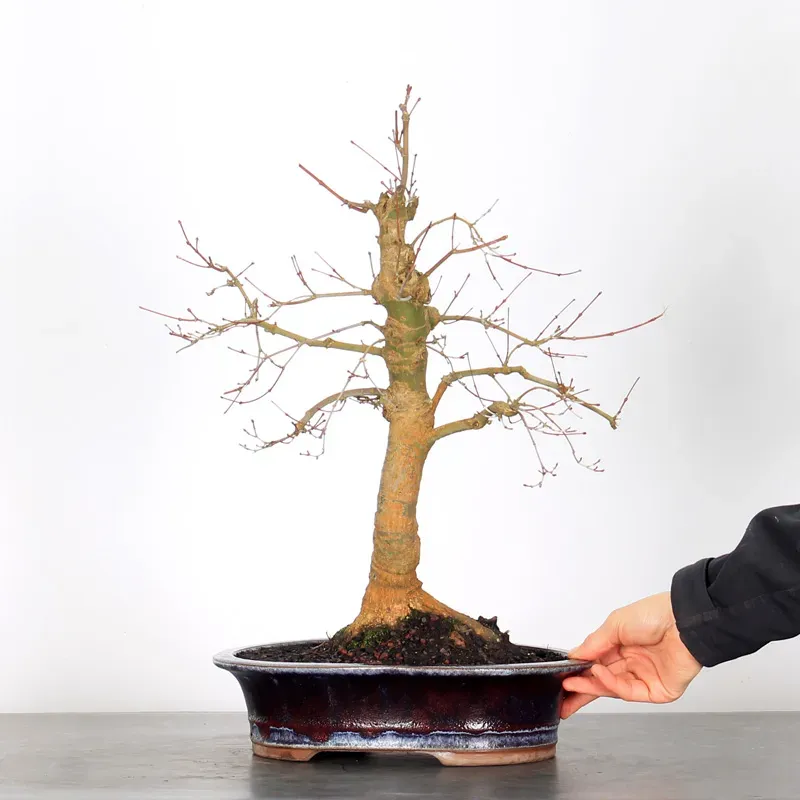 The Japanese red Maple "Deshojo" bonsai captivates with its spectacular evolution throughout the seasons. Its foliage begins a deep red in spring, gradually turning green in summer, and then displays superb shades of orange-red in autumn, offering a magnificent spectacle to behold all year round.