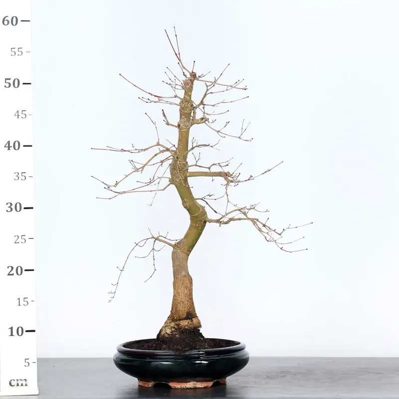 The Japanese red Maple "Deshojo" bonsai captivates with its spectacular evolution throughout the seasons. Its foliage begins a deep red in spring, gradually turning green in summer, and then displays superb shades of orange-red in autumn, offering a magnificent spectacle to behold all year round.