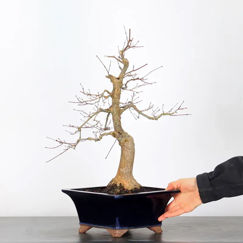 The Japanese red maple "Deshojo" bonsai captivates with its spectacular evolution throughout the seasons. Its foliage begins a deep red in spring, gradually turning green in summer, and then displays superb shades of orange-red in autumn, offering a magnificent spectacle to behold all year round.