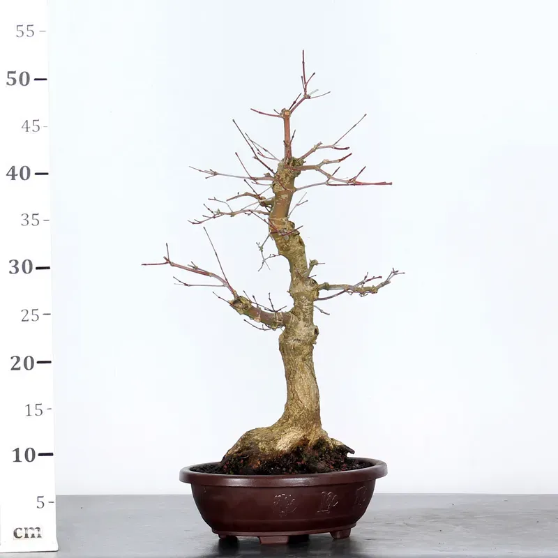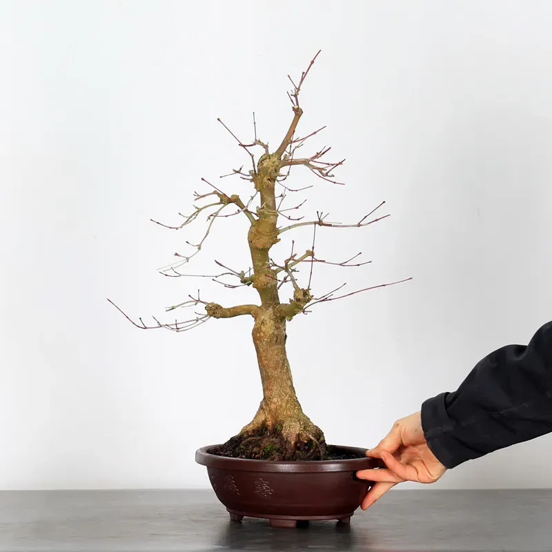 The Japanese red Maple "Deshojo" bonsai captivates with its spectacular evolution throughout the seasons. Its foliage begins a deep red in spring, gradually turning green in summer, and then displays superb shades of orange-red in autumn, offering a magnificent spectacle to behold all year round.