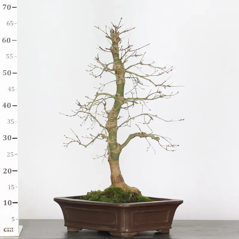 The Japanese red maple "Deshojo" bonsai captivates with its spectacular evolution throughout the seasons. Its foliage begins a deep red in spring, gradually turning green in summer, and then displays superb shades of orange-red in autumn, offering a magnificent spectacle to behold all year round.