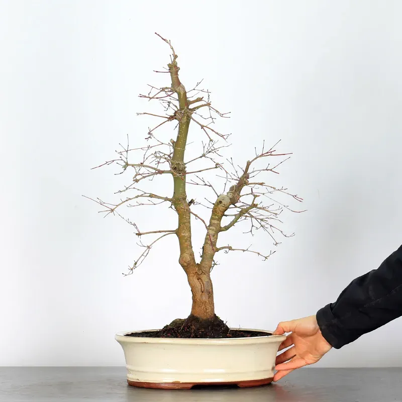 The Japanese red Maple "Deshojo" bonsai captivates with its spectacular evolution throughout the seasons. Its foliage begins a deep red in spring, gradually turning green in summer, and then displays superb shades of orange-red in autumn, offering a magnificent spectacle to behold all year round.