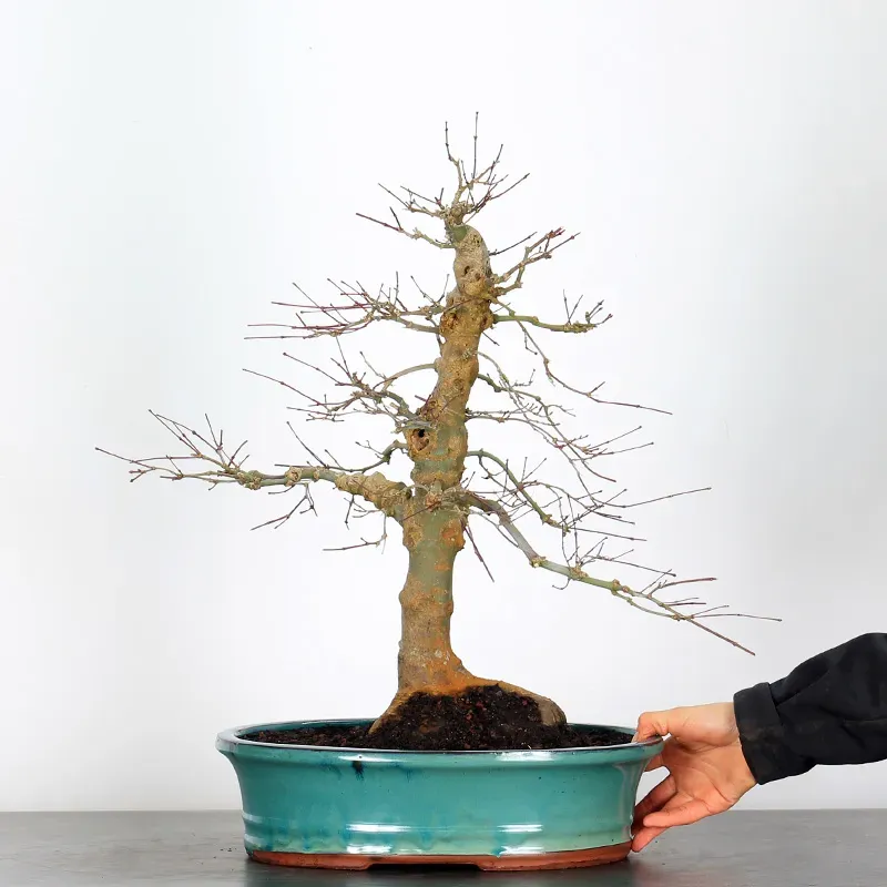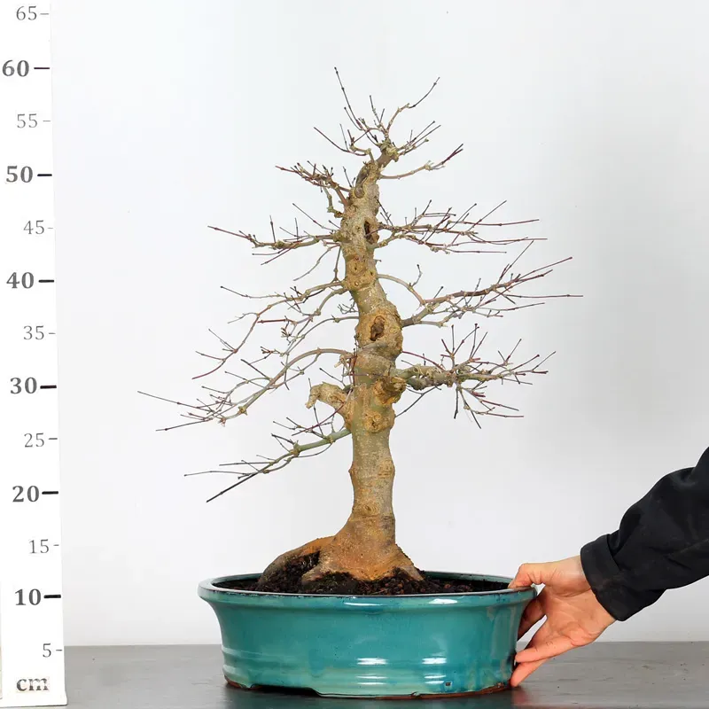 The Japanese red Maple "Deshojo" bonsai captivates with its spectacular evolution throughout the seasons. Its foliage begins a deep red in spring, gradually turning green in summer, and then displays superb shades of orange-red in autumn, offering a magnificent spectacle to behold all year round.