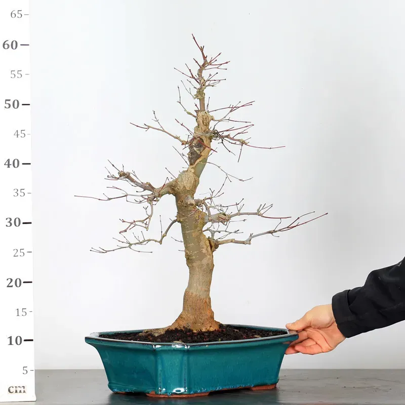 The Japanese red Maple "Deshojo" bonsai captivates with its spectacular evolution throughout the seasons. Its foliage begins a deep red in spring, gradually turning green in summer, and then displays superb shades of orange-red in autumn, offering a magnificent spectacle to behold all year round.