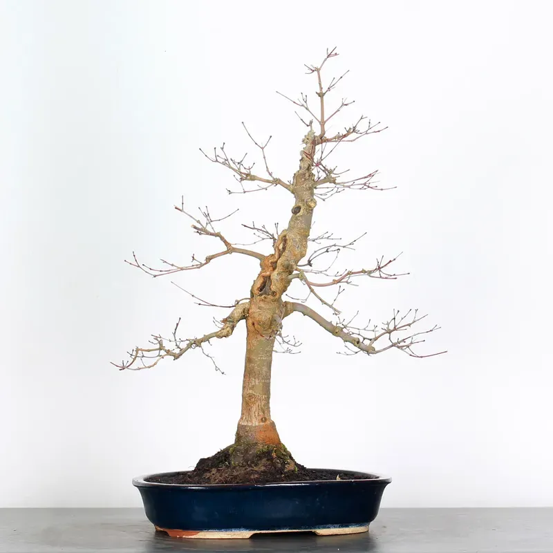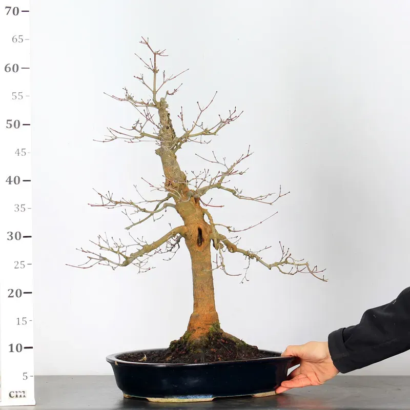 The Japanese red Maple "Deshojo" bonsai captivates with its spectacular evolution throughout the seasons. Its foliage begins a deep red in spring, gradually turning green in summer, and then displays superb shades of orange-red in autumn, offering a magnificent spectacle to behold all year round.