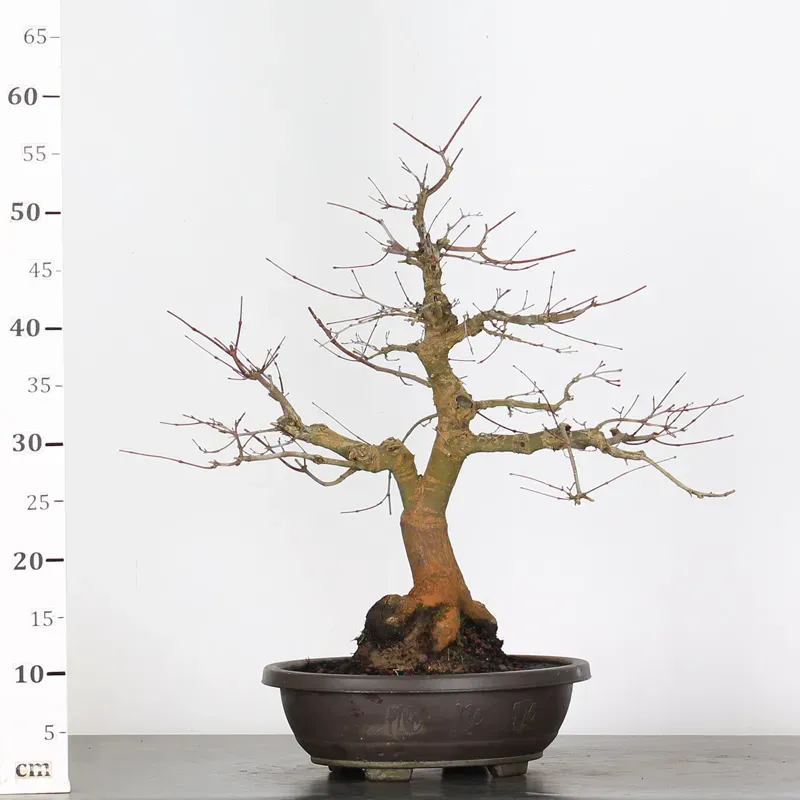 The Japanese red Maple "Deshojo" bonsai captivates with its spectacular evolution throughout the seasons. Its foliage begins a deep red in spring, gradually turning green in summer, and then displays superb shades of orange-red in autumn, offering a magnificent spectacle to behold all year round.