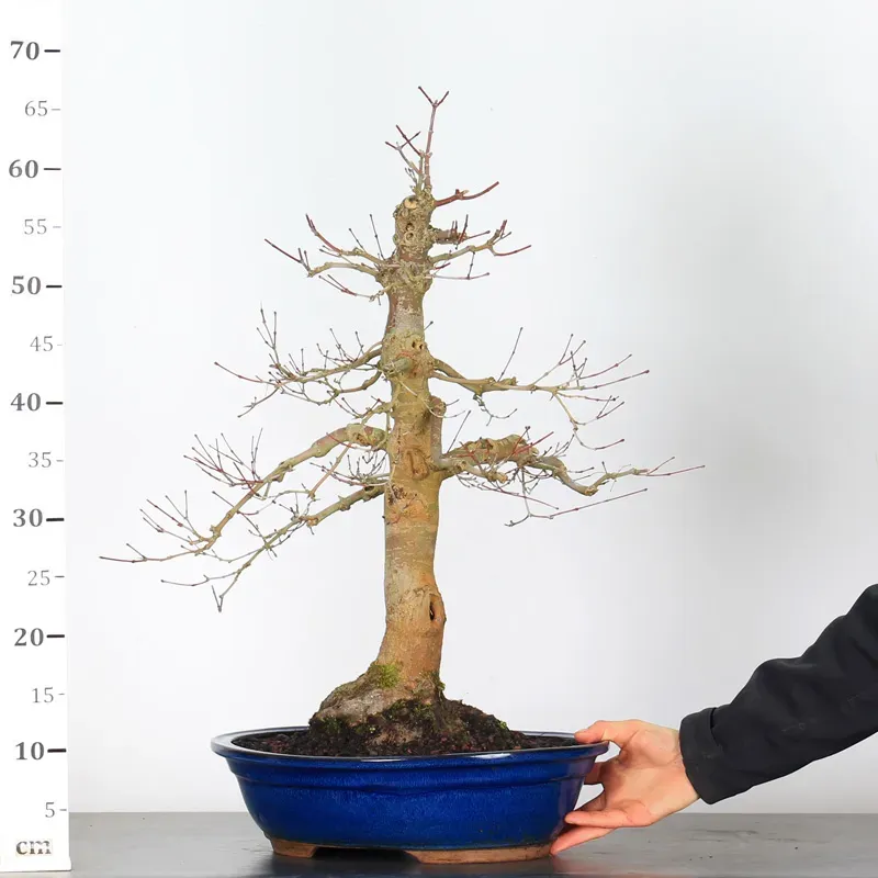 The Japanese red maple "Deshojo" bonsai captivates with its spectacular evolution throughout the seasons. Its foliage begins a deep red in spring, gradually turning green in summer, and then displays superb shades of orange-red in autumn, offering a magnificent spectacle to behold all year round.