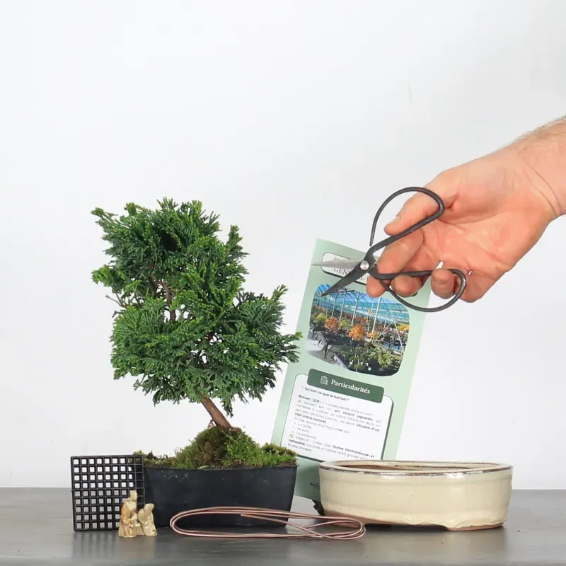 Create and care for your faux cypress bonsai with this complete kit. Ideal for repotting and pruning, it contains everything you need to care for your tree: a detailed instruction sheet, a drainage grid, an elegant pot, a pair of precision Japanese scissors, and wiring. Perfect for beginners or those looking to refine their bonsai skills.