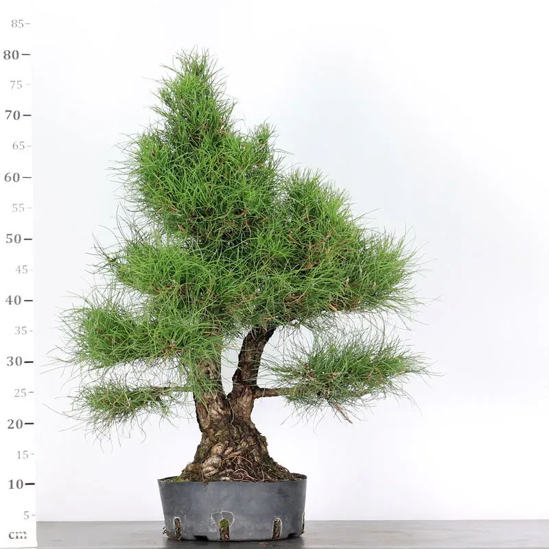 The Scots Pine bonsai "Pinus sylvestris" is a majestic and robust conifer, renowned for its longevity and remarkable adaptability, although it prefers mountain climates. Ideal for those wishing to shape their own bonsai, it offers an excellent working base thanks to its still-flexible wood, slender trunk, and laminated bark that turns ochre-red to russet over time, allowing for easy wiring and shaping. Versatile and durable, it is suitable for various styles and effectively supports the tree's development over time.