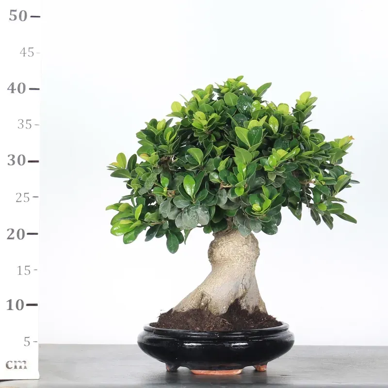 The Ficus Microcarpa "Ginseng" is a bonsai that captivates with its thick trunk and exposed roots, giving it a unique, sculptural appearance.