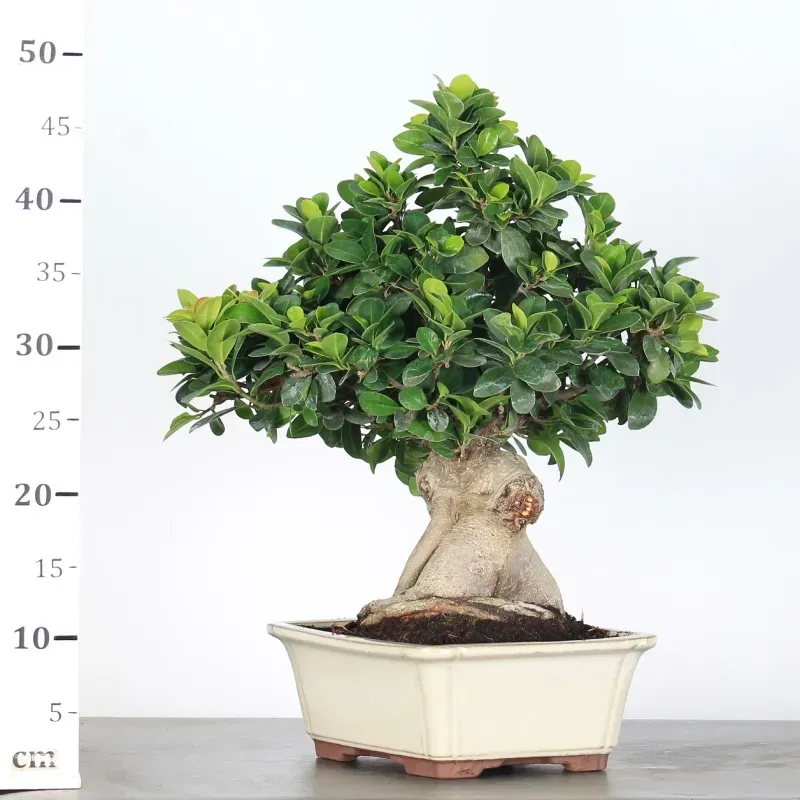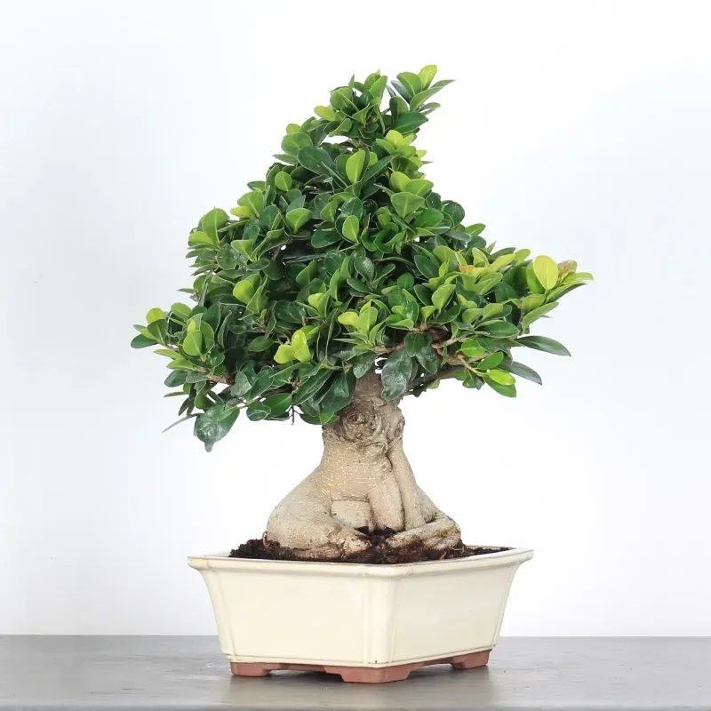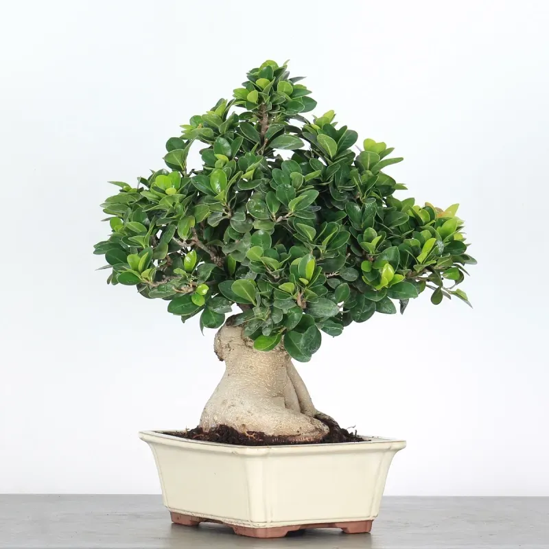 The Ficus Microcarpa "Ginseng" is a bonsai that captivates with its thick trunk and exposed roots, giving it a unique, sculptural appearance.