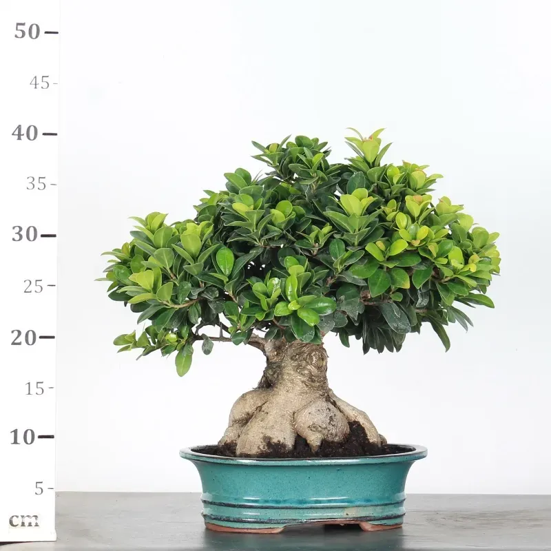 The Ficus Microcarpa "Ginseng" is a bonsai that captivates with its thick trunk and exposed roots, giving it a unique, sculptural appearance.