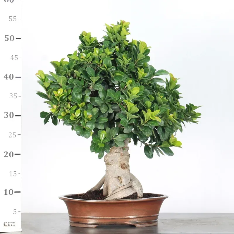 The Ficus Microcarpa "Ginseng" is a bonsai that captivates with its thick trunk and exposed roots, giving it a unique, sculptural appearance.