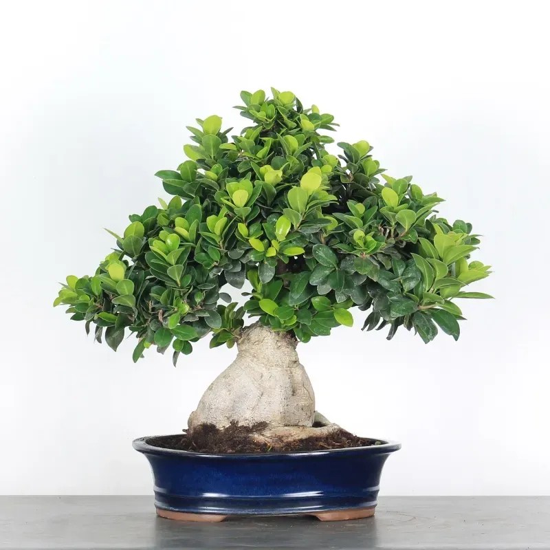 The Ficus Microcarpa "Ginseng" is a bonsai that captivates with its thick trunk and exposed roots, giving it a unique, sculptural appearance.