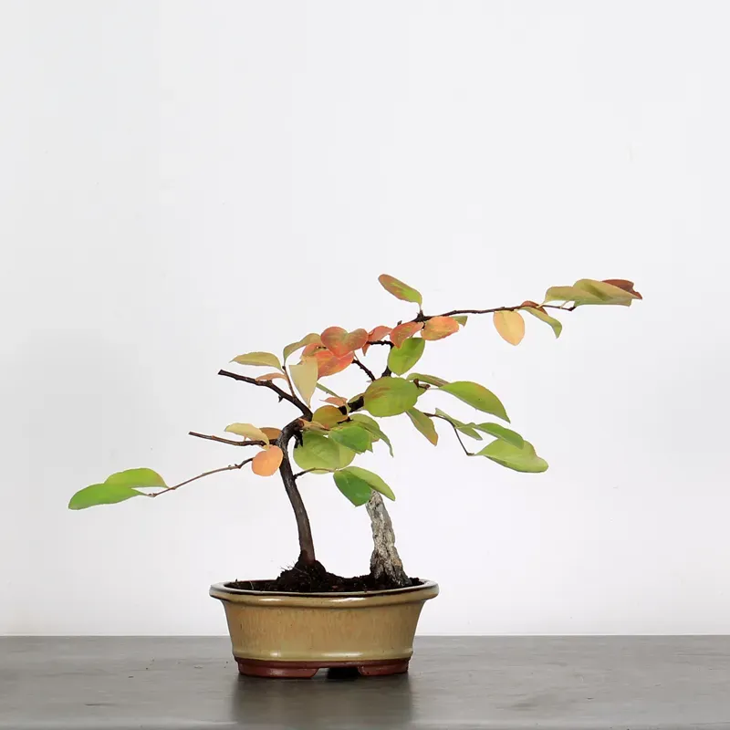 The quince tree "Cydonia oblonga" is a small fruit tree ideal for bonsai. It is easy to train and wire, making it perfect for beginners. Its foliage turns beautiful red and orange hues in the fall, and with good care, it can flower and produce beautiful, fragrant fruit after a few years.