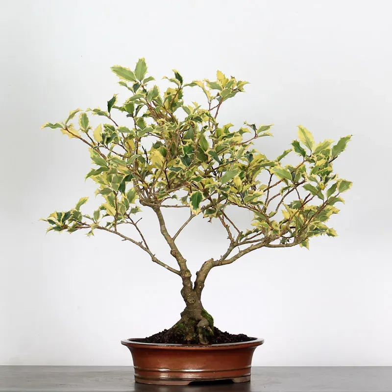 The Holly bonsai "Ilex golden milkboy" is an evergreen shrub distinguished by its dark green leaves and compact structure. Depending on the variety, it produces small, decorative red berries in autumn and winter. Prized for its cold hardiness, it adapts well to temperate climates. A decorative and timeless bonsai, perfect for both amateurs and enthusiasts.
