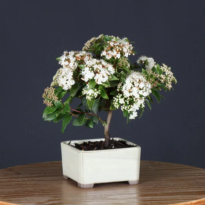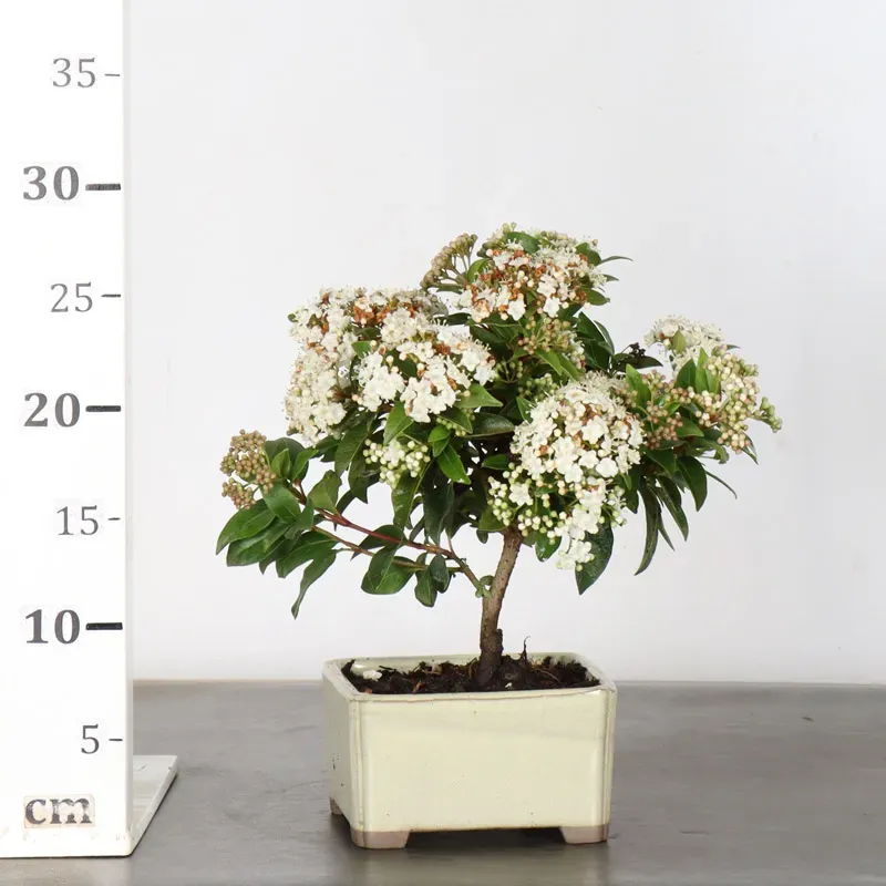 The Tin Laurel, also known as Viorne "Viburnum tinus", is a bonsai tree with attractive evergreen foliage and small white winter flowers. Easy to grow, it adapts well to different types of soil, provided they are well drained.