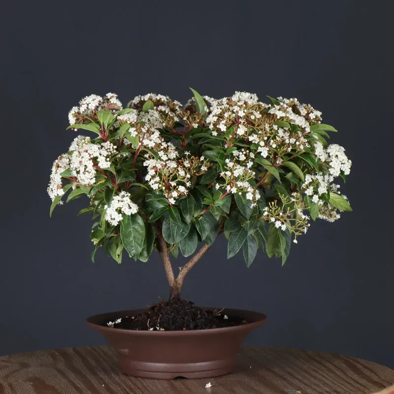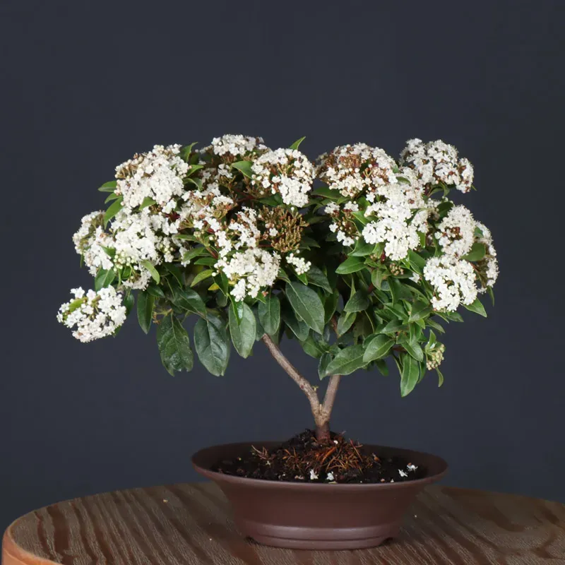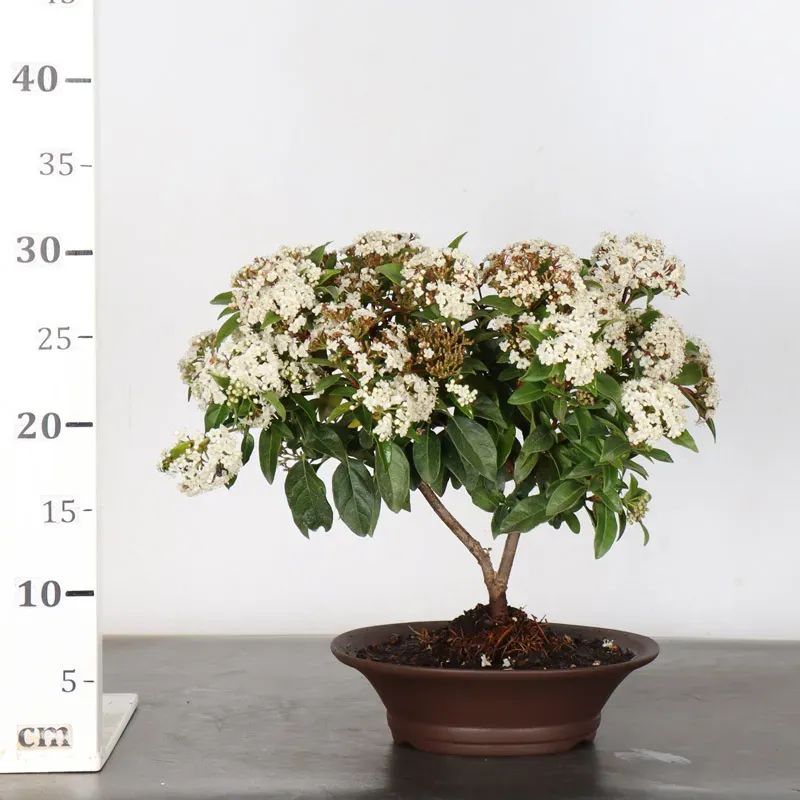 The Tin Laurel, also known as Viorne "Viburnum tinus", is a bonsai tree with attractive evergreen foliage and small white winter flowers. Easy to grow, it adapts well to different types of soil, provided they are well drained.