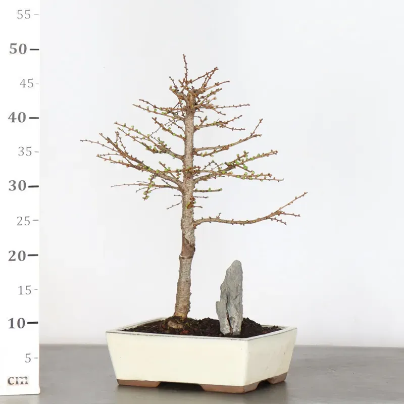 The Larch bonsai "Larix decidua" is a deciduous conifer appreciated for its textured trunk and soft needles that turn golden in autumn before falling. It tolerates pruning well and adapts well to upright and informal styles. Prefers full sun exposure and requires wintering outdoors, away from severe frost.