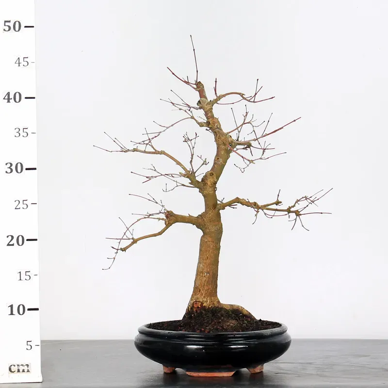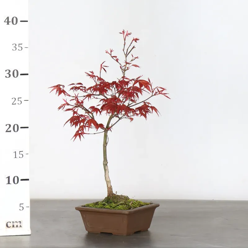 The Japanese red Maple "Deshojo" bonsai captivates with its spectacular evolution throughout the seasons. Its foliage begins a deep red in spring, gradually turning green in summer, and then displays superb shades of orange-red in autumn, offering a magnificent spectacle to behold all year round.