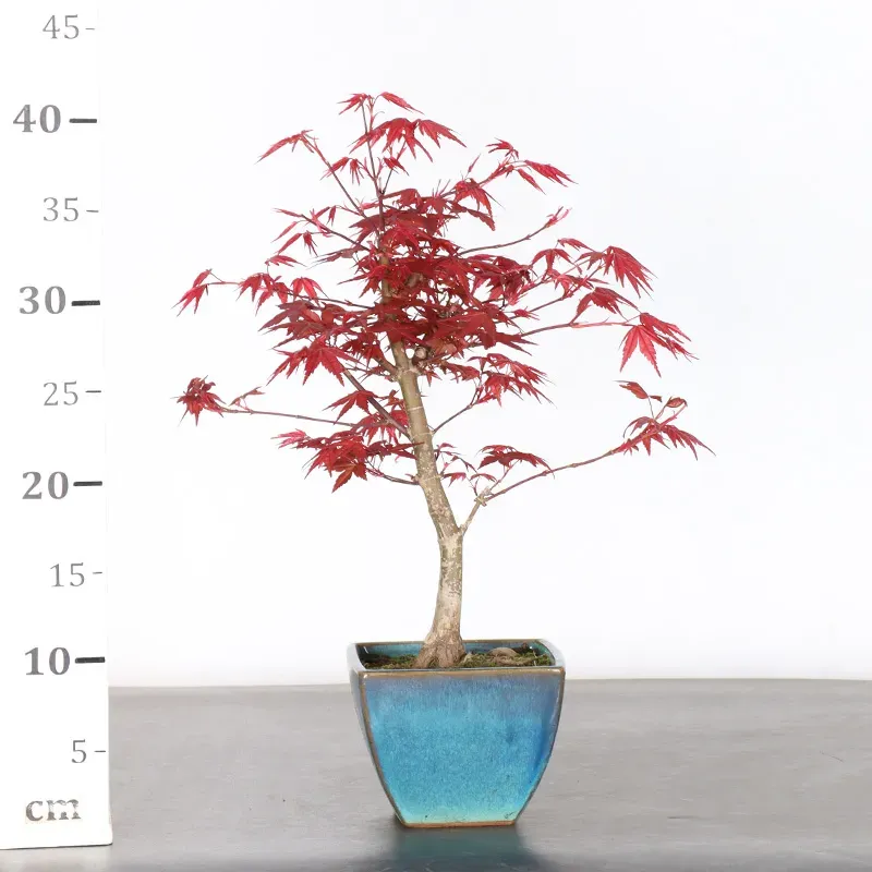 The Japanese red Maple "Deshojo" bonsai captivates with its spectacular evolution throughout the seasons. Its foliage begins a deep red in spring, gradually turning green in summer, and then displays superb shades of orange-red in autumn, offering a magnificent spectacle to behold all year round.