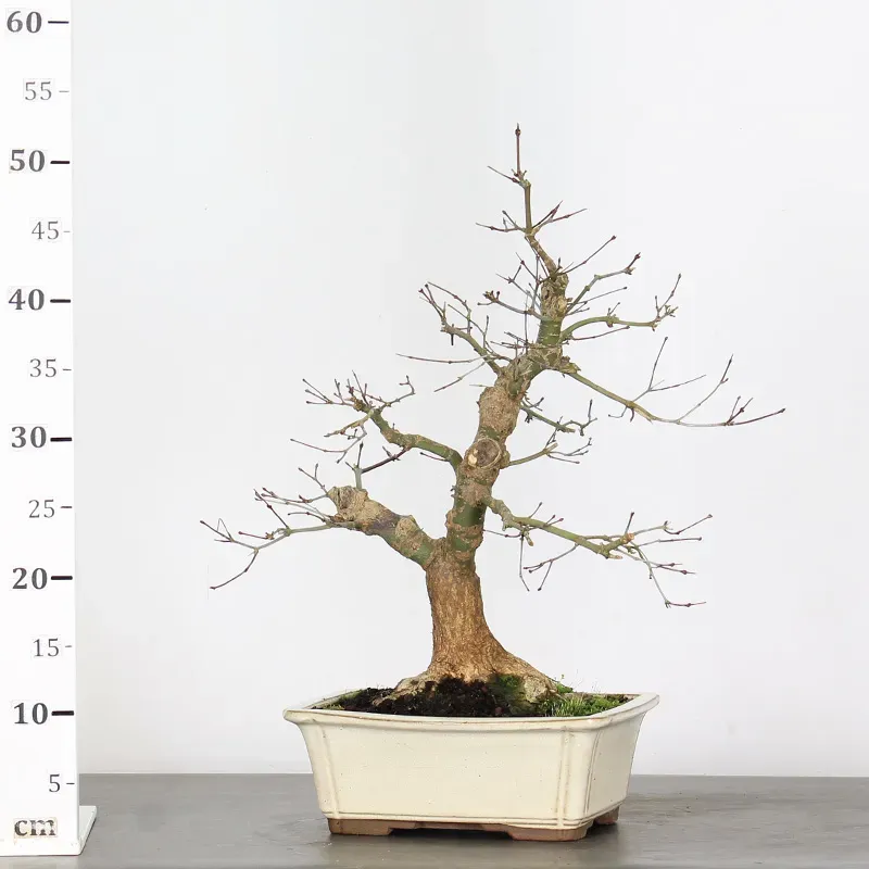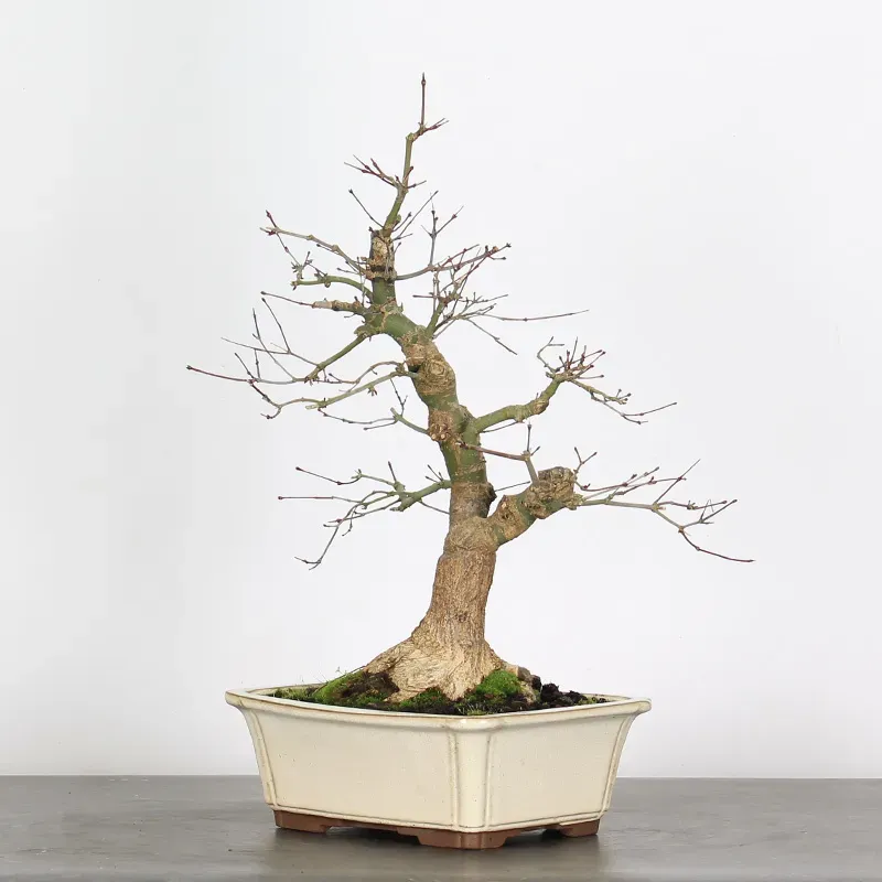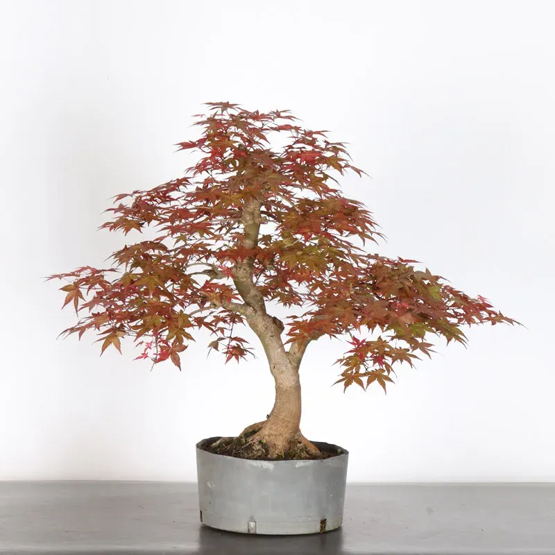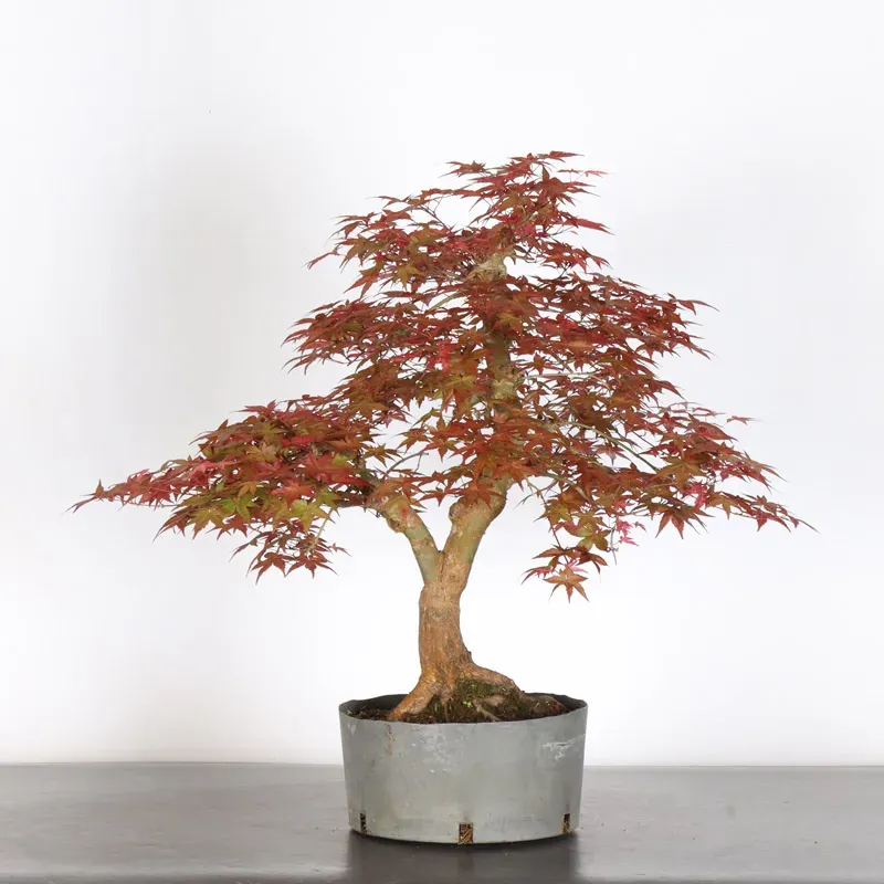 The Japanese red Maple "Deshojo" bonsai captivates with its spectacular evolution throughout the seasons. Its foliage begins a deep red in spring, gradually turning green in summer, and then displays superb shades of orange-red in autumn, offering a magnificent spectacle to behold all year round.