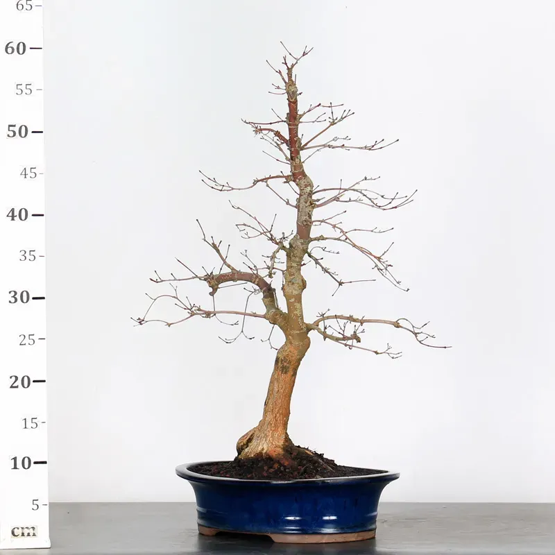 The Japanese red Maple "Deshojo" bonsai captivates with its spectacular evolution throughout the seasons. Its foliage begins a deep red in spring, gradually turning green in summer, and then displays superb shades of orange-red in autumn, offering a magnificent spectacle to behold all year round.