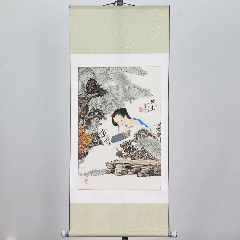 Materials : Kakejiku textile mounting (hanging scroll), calligraphy brush and ink, watercolor
