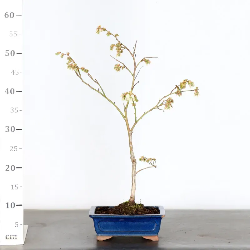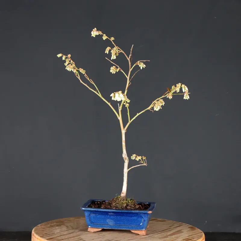 Le bonsaï myrtillier "Vaccinium Corymbosum Hardy Blue" est une variété à la fois décoratif et productif, idéale pour les amateurs de plantes originales. Ce petit arbuste fruitier séduit par son feuillage délicat, vert brillant au printemps et en été, qui se pare de superbes teintes rouges à l’automne. Facile à cultiver en pot, il s’adapte parfaitement à la culture en bonsaï.