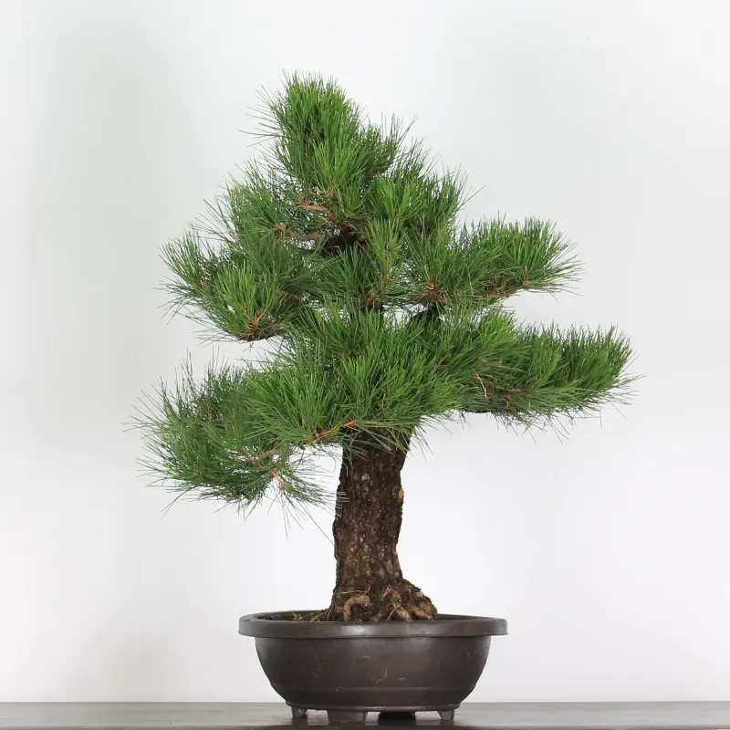 Le Pin Thunbergii est une essence de virilité par excellence: arbre droit, magnifique, puissant, bien "assis" dans son pot, se dresse vers le ciel. Le tronc sombre, avec une écorce crevassée, offre un saisissant contraste avec les aiguilles vert assez clair, pleines de fraîcheur et de santé.