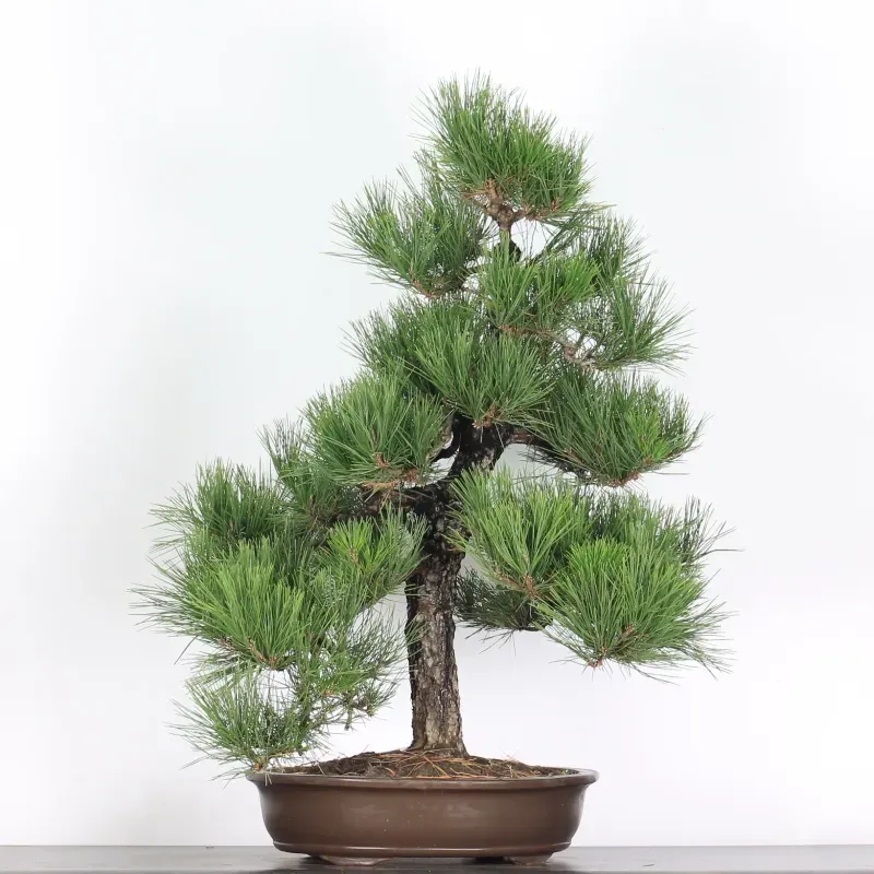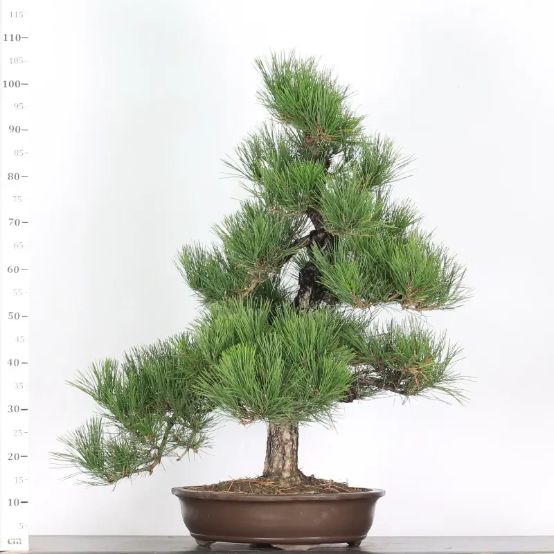 Le Pin Thunbergii est une essence de virilité par excellence: arbre droit, magnifique, puissant, bien "assis" dans son pot, se dresse vers le ciel. Le tronc sombre, avec une écorce crevassée, offre un saisissant contraste avec les aiguilles vert assez clair, pleines de fraîcheur et de santé.