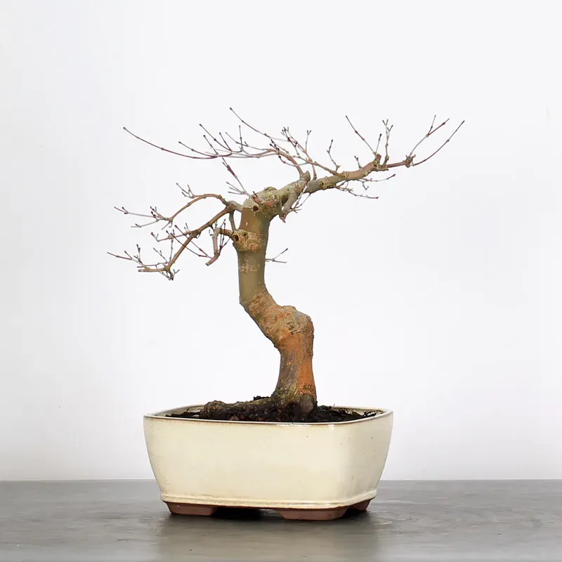 L’Erable rouge du Japon "Deshojo" en bonsaï séduit par son évolution spectaculaire au fil des saisons. Son feuillage démarre rouge profond au printemps, devient progressivement vert en été, puis se pare de superbes teintes rouge orangé à l’automne, offrant un magnifique spectacle à contempler tout au long de l’année.