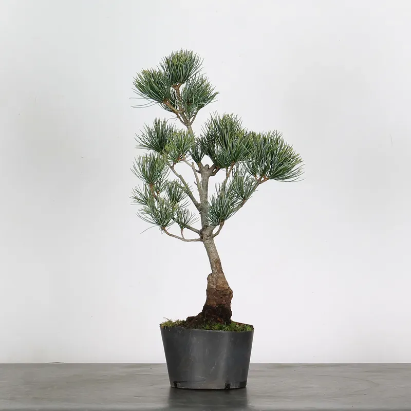Le bonsaï pin blanc japonais "pinus pentaphylla" est un arbre populaire en raison de ses aiguilles fines engainées par cinq, couleurs vert/bleu, il peut être façonné pour présenter des mouvements gracieux de branches et un tronc élégant, il a plutôt une croissance lente