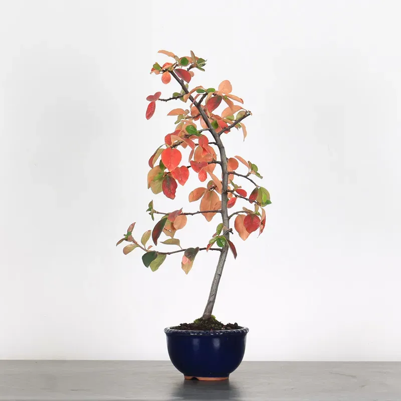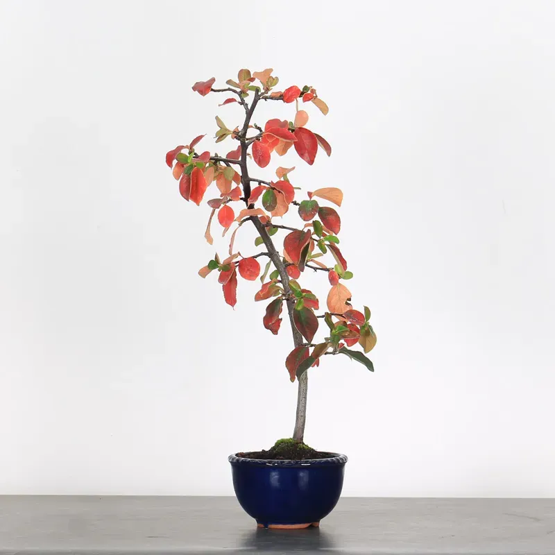 Le cognassier "cydonia oblonga" est un petit arbre fruitier idéal pour la culture en bonsaï. Il est facile à former et à ligaturer, ce qui le rend parfait pour les débutants. Son feuillage prend de belles teintes rouges et orangées à l’automne, et avec de bons soins, il peut fleurir et produire de jolis fruits parfumés au bout de quelques années.