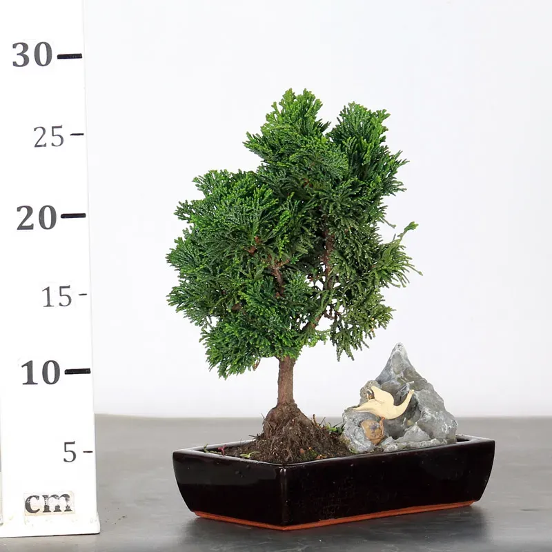 Le bonsaï de faux cyprès du Japon "Chamaecyparis obtusa Nana Gracilis" est un conifère rustique au feuillage dense et écailleux, très apprécié pour son port original et son élégance d’inspiration japonaise. Son bois souple se prête bien à la ligature, ce qui en fait un excellent sujet pour le bonsaï. Persistant, il conserve son feuillage vert toute l’année et supporte bien le froid.