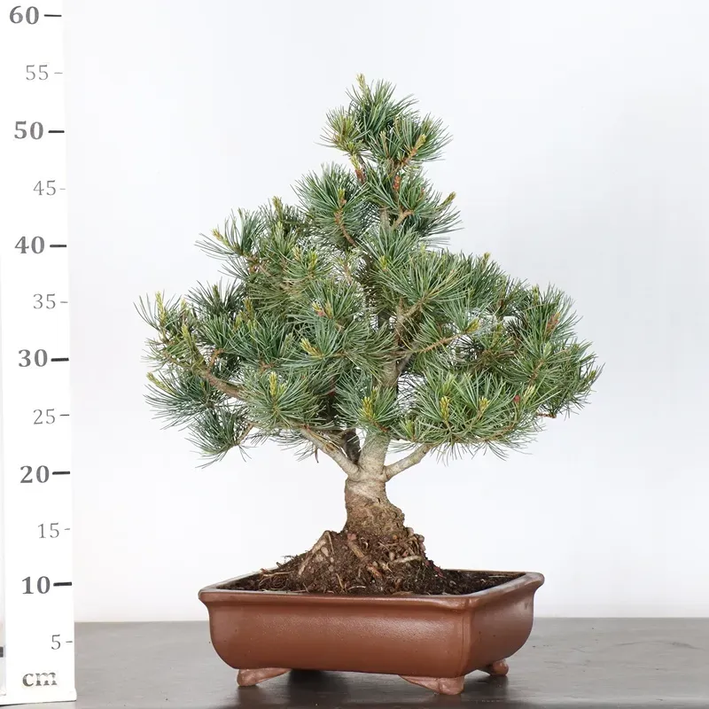 Le bonsaï pin blanc japonais est un conifère emblématique et populaire en raison de ses aiguilles fines engainées par cinq, couleurs vert/bleu, il peut être façonné pour présenter des mouvements gracieux de branches et un tronc élégant, c'est un arbre qui a plutôt une croissance lente.