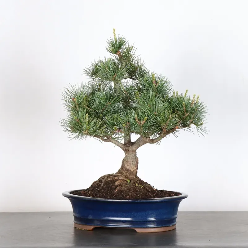 Le bonsaï pin blanc japonais est un conifère emblématique et populaire en raison de ses aiguilles fines engainées par cinq, couleurs vert/bleu, il peut être façonné pour présenter des mouvements gracieux de branches et un tronc élégant, c'est un arbre qui a plutôt une croissance lente.